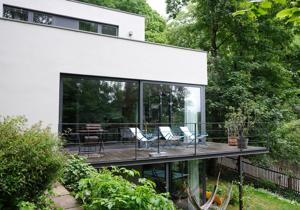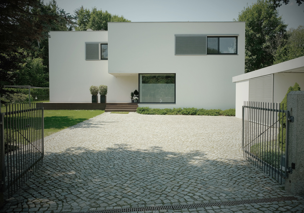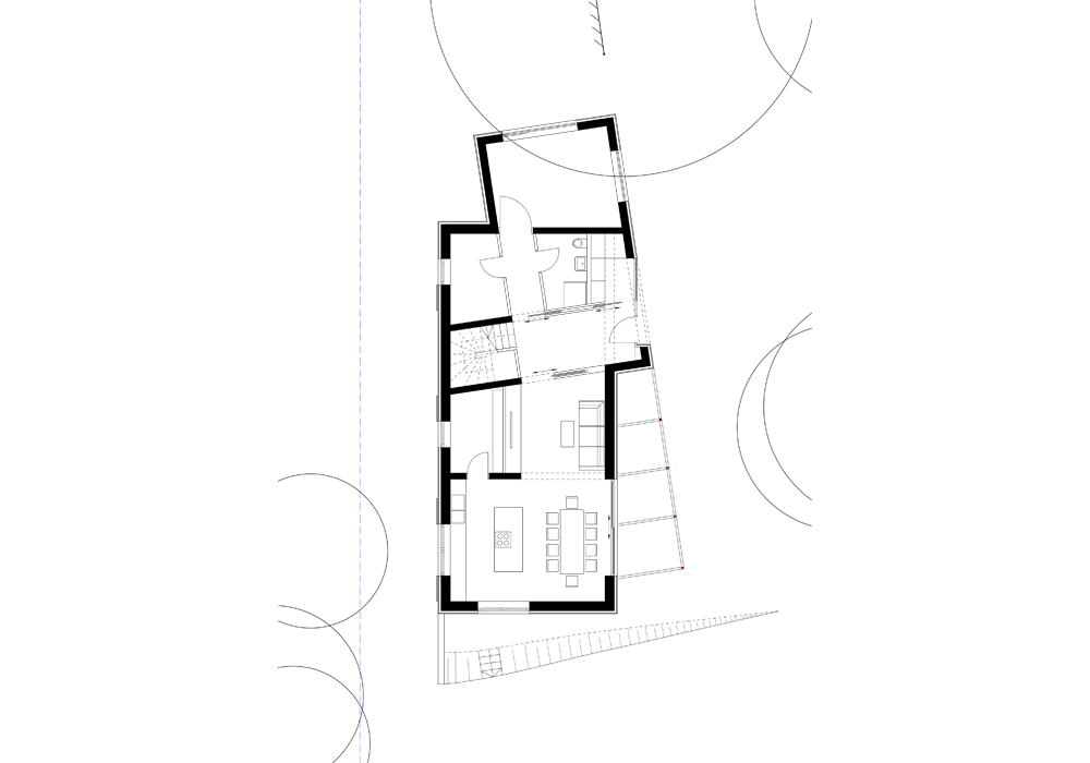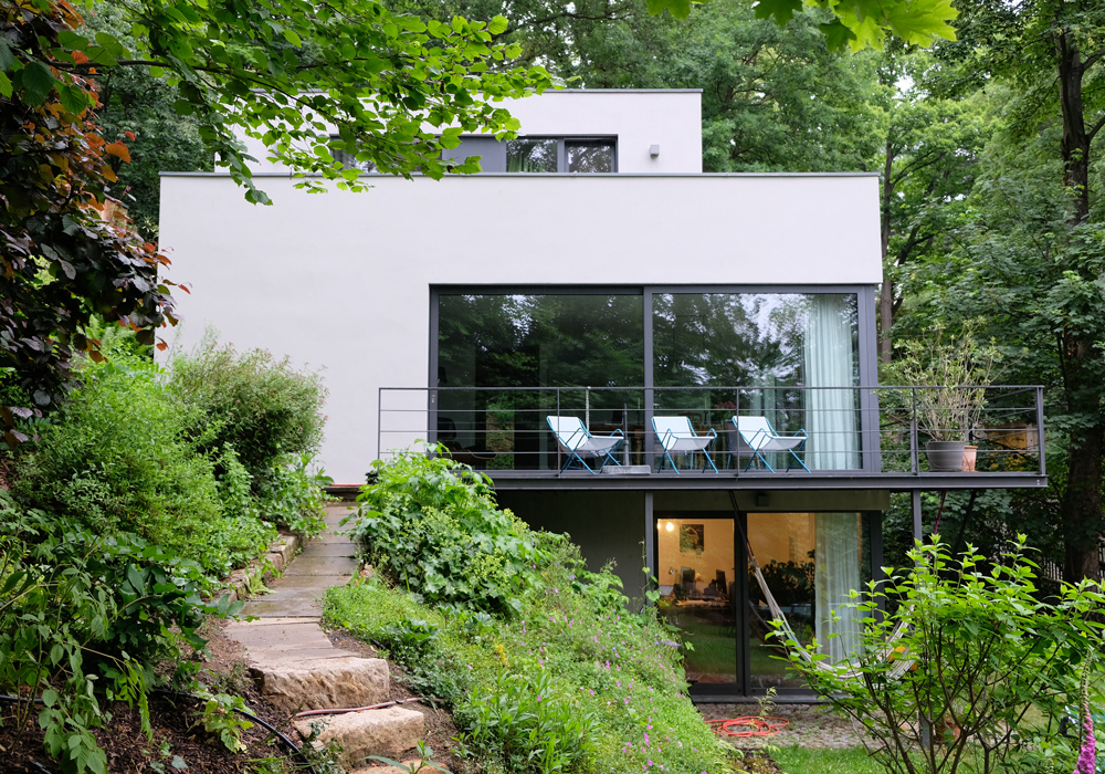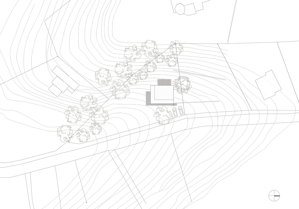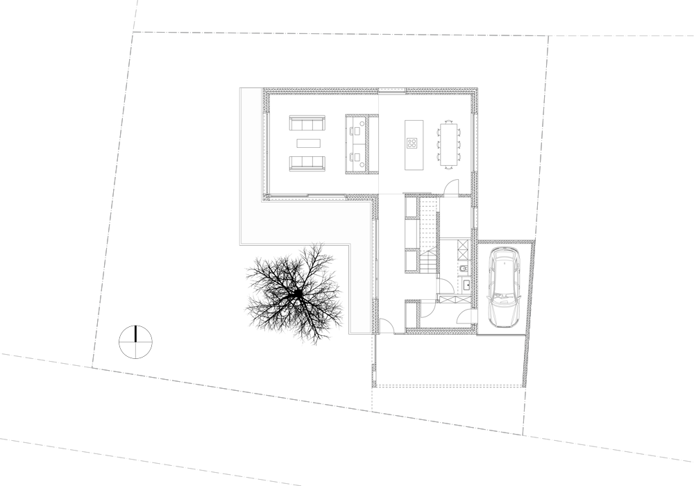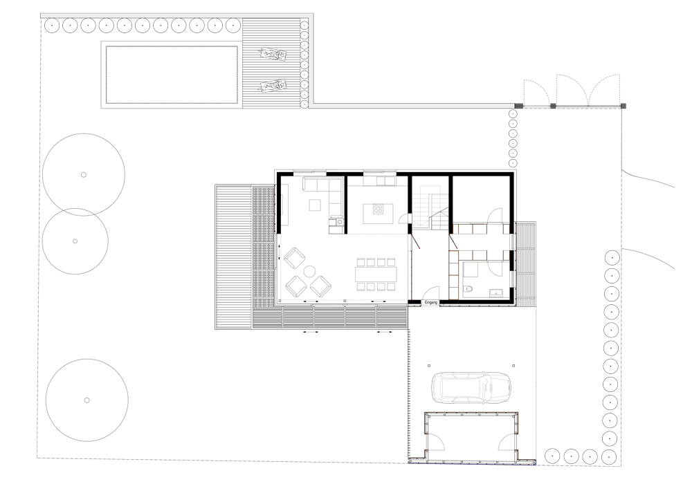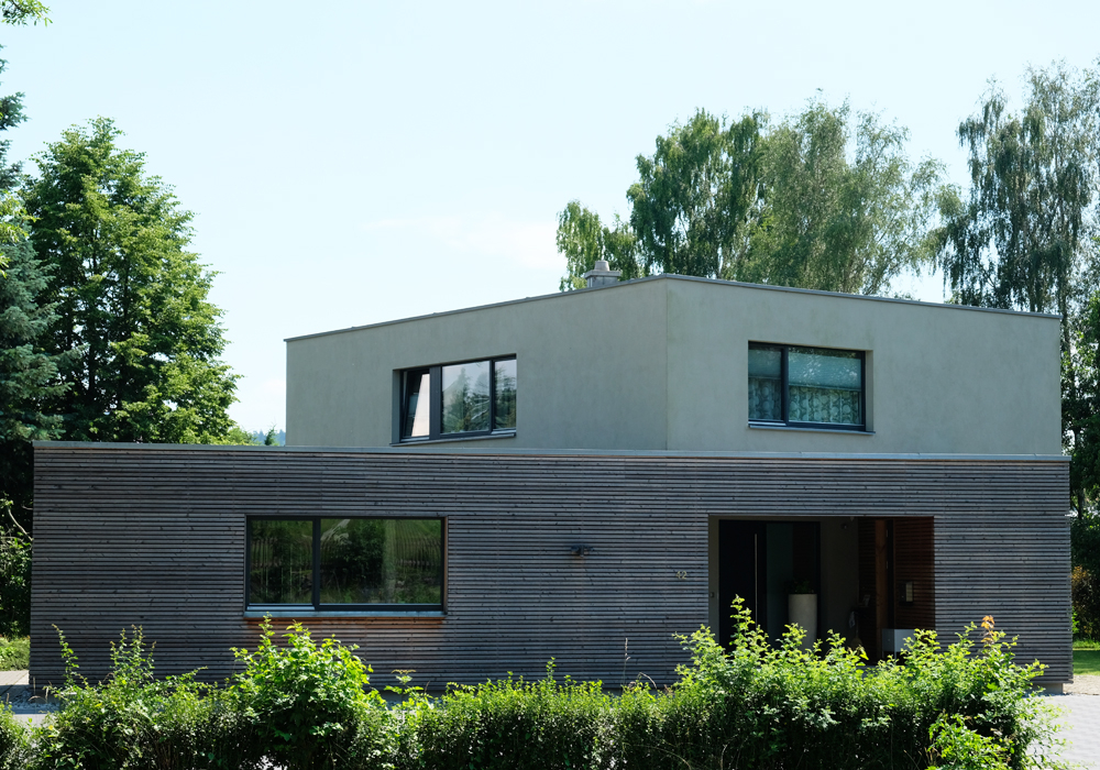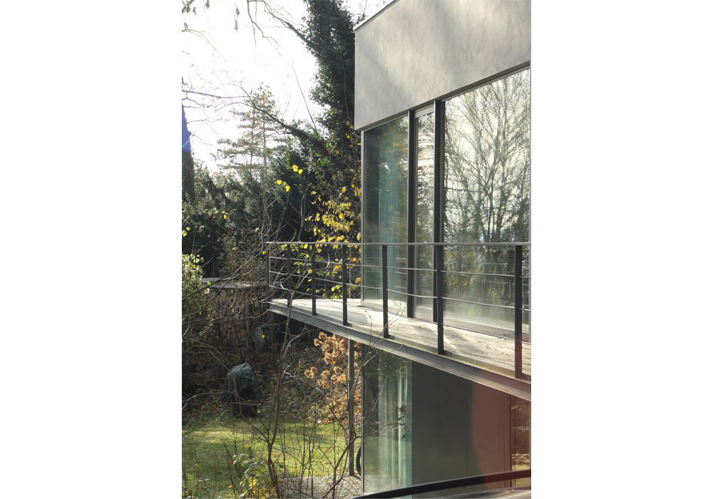 In zweiter Reihe mitten im Grünen wurde das dreigeschoßige Wohnhaus für eine vierköpfige Familie konzipiert. Umgeben von weiteren Einfamilienhäusern bestand der Wunsch nach einem Gebäude, welches zum einen Sichtschutz bietet, zum anderen auch den Außenraum mit seinem alten Baumbestand mit einbezieht. So wurde im östlichen Zugangsbereich ein Carport/ Schuppenanbau geplant. Eine Pergola ermöglicht zusätzlichen Schutz. Eine sehr großzügige Dachterrasse über dem 1. Obergeschoß bietet weiteren Aussenraum. Ergänzt wird das Ensemble durch einen Pool.