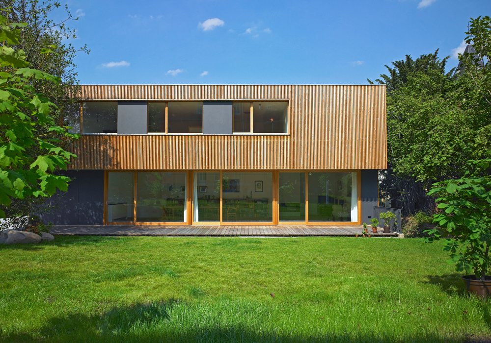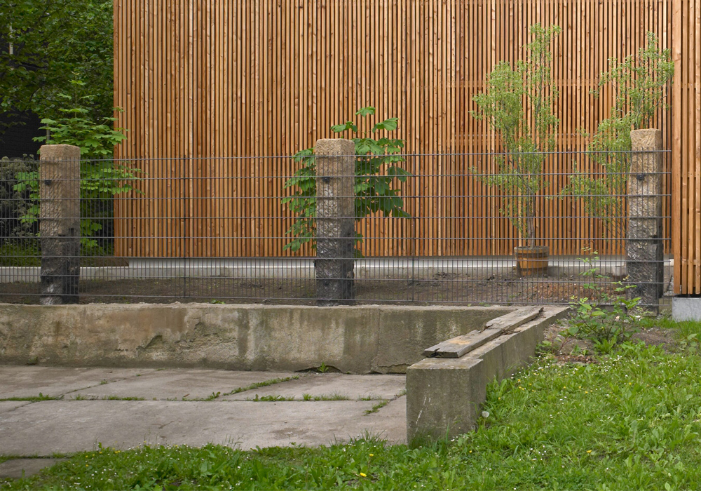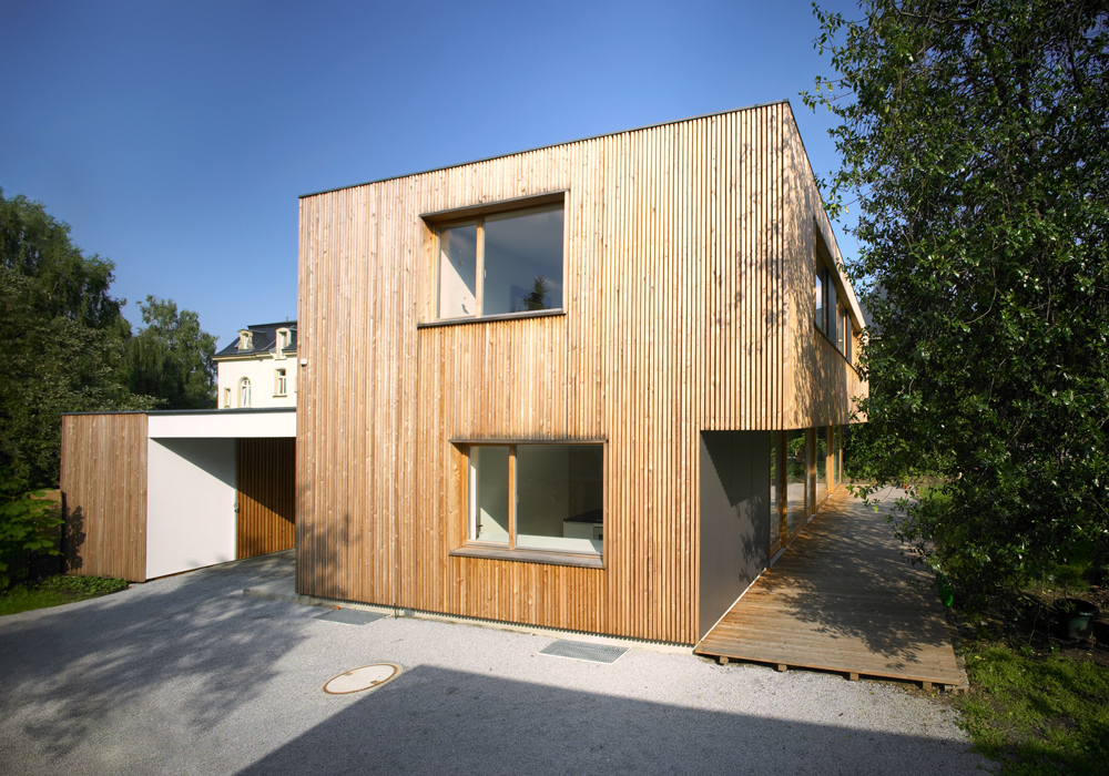 Im stark durchgrünten Stadtteil Hellerau, umgeben von altem Laubwaldbestand und großzügigen Gärten entsteht ein Einfamilienhaus für eine vierköpfige Familie. Beim Entwurf waren neben den städtebaulichen Randbedingungen auch die spezifische Gestaltungssatzung für Hellerau zu berücksichtigen. Das Gebäude wurde als zweigeschoßiger Kubus mit Satteldach geplant. Ein eingeschoßiger Anbau mit Flachdach bildet unter Einbeziehung des Geländeverlaufs den Eingangsbereich und beherbergt ein Büro. Die Aussenwandverkleidung aus einer naturbelassenen Holzverschalung verbindet die unterschiedlichen Bauformen zu einem spannungsvollen Ensemble.