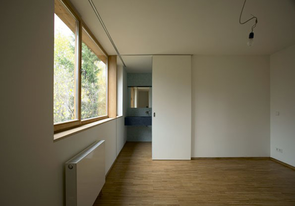 Das Einfamilienhaus ist für eine dreiköpfige Familie konzipiert. Klare Formen und Materialien zeichnen das Gebäudeensemble aus. Die beiden aus Sichtbeton bestehenden miteinander verschnittenen Kuben bilden gemeinsam mit dem holzverkleideten Carport/ Garagenanbau eine harmonische Einheit. Der Innenraum zeichnet sich durch fließende Räume und Sichtachsen aus. Die großen Holz-Schiebeelemente im Erdgeschoß stellen den Bezug zum Außenraum her.