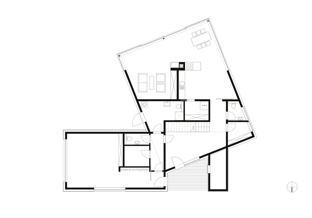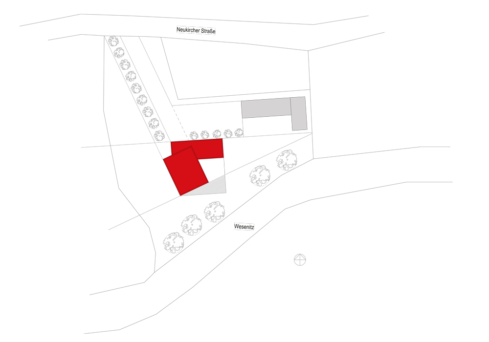 Dem Wunsch des Bauherren nach einer Verknüpfung privater Wohnnutzung und einem Bürobereich wurde durch die Verschränkung von zwei Baukörpern, welche sich am Grundstückszuschnitt orientiert, erreicht. Durch ihre unterschiedliche Geschossigkeit und Materialität wird eine klare Grenze zwischen den Nutzungen gezogen. Das zweigeschossige Wohnhaus öffnet sich seiner großen Glasfront zu einem Bach in Richtung Süden. Der eingeschossige Büroanbau ist dem Wohngebäude im Norden vorgelagert und ermöglicht so die Privatsphäre der Bewohner.