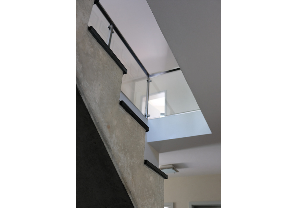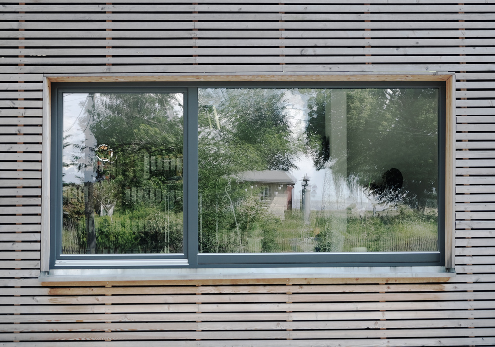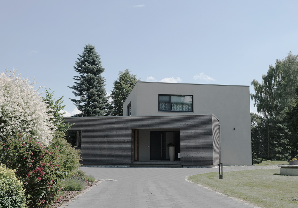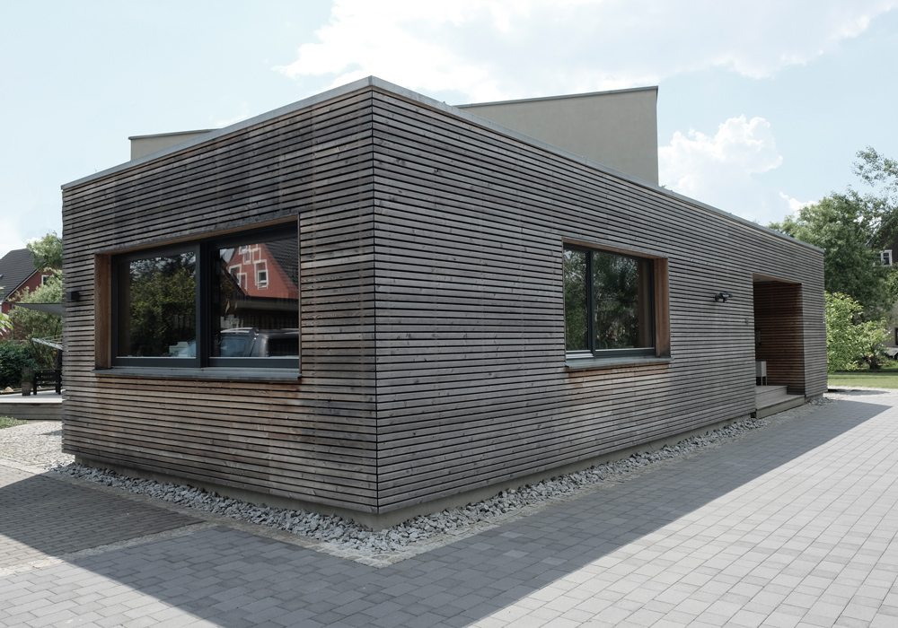 Dem Wunsch des Bauherren nach einer Verknüpfung privater Wohnnutzung und einem Bürobereich wurde durch die Verschränkung von zwei Baukörpern, welche sich am Grundstückszuschnitt orientiert, erreicht. Durch ihre unterschiedliche Geschossigkeit und Materialität wird eine klare Grenze zwischen den Nutzungen gezogen. Das zweigeschossige Wohnhaus öffnet sich seiner großen Glasfront zu einem Bach in Richtung Süden. Der eingeschossige Büroanbau ist dem Wohngebäude im Norden vorgelagert und ermöglicht so die Privatsphäre der Bewohner.